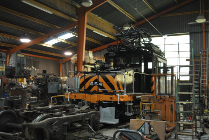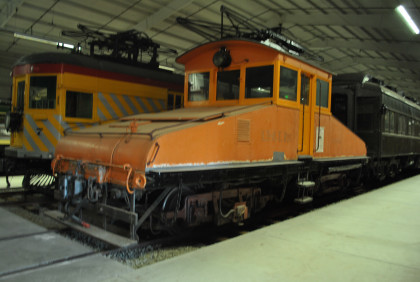 Sacramento Northern 65 ton steeple cab 654 built by General Electric in 1930. By time it was delivered, the Sacramento Northern Railroad and San Francisco-Sacramento merger had already taken place and it was delivered as SN 654. At some point it received the trucks from SN 670, which was the former Tidewater Southern motor 106 that SN purchased secondhand. Evidence uncovered at the Museum indicates that 654 was involved in an accident serious enough at some point in its life to require the replacement of one entire side sill. It was in service on the Sacramento Northern until the end of electric operation in 1965.
