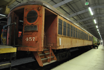 Pacific Electric arch-roof, double-end, double-truck, steel coach 457 built by American Car and Foundry in 1911 as Southern Pacific 332. It features a smoking compartment. The car was built with large square windows in the front and rear and was painted dark olive green. The cars were repainted to Southern Pacific's distinctive red starting in 1912 to improve their visibility in poor weather and at night. The cars received round porthole style end windows, reportedly to improve crew safety. The car had 3 and 2 seating and were very light for the number of passengers they carried.
