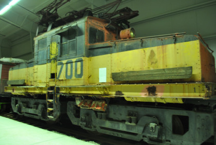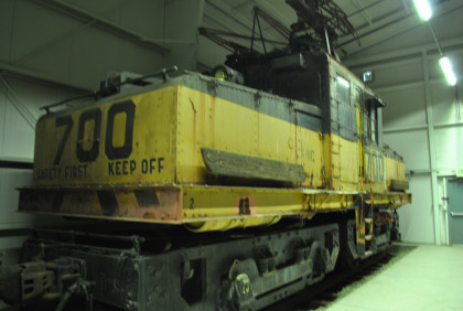 Kennecott Copper 75 ton steeplecab electric switcher 700 built by General Electric in 1926 for the Utah Copper Company, who acquired it as a prototype for use in their Bingham Canyon copper pit mine. 700 proved to be superior to both competing steam and diesel locomotive types, and in time it was joined by 64 other locomotives of this class. It was retired in August 1984 when the copper pit converted to conveyor belts for moving copper ore, and was donated to the Western Railway Museum. The carbody was painted black while under Utah Copper Company ownership and yellow with black trim after Bingham Canyon became part of the Kennecott Copper Corporation; Utah Copper Company became part of the Kennecott Copper Company in 1936.