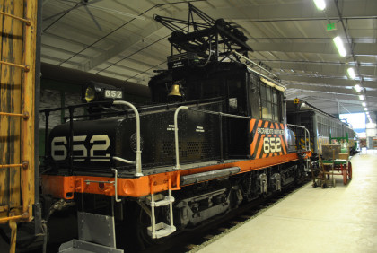 Sacramento Northern 65 ton steeplecab switcher 652 built by General Electric in 1928 as Sacramento Northern 1052 and was re-numbered after the Sacramento Northern Railroad and San Francisco-Sacramento merger. It was retained by the Sacramento Northern Railway until the end of electric operation in 1965. Near the end of electric operation the locomotive was used as a source of spare parts to keep 653 and 654 operational.