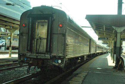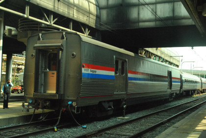 Brand new Viewliner baggage car 61007. Robin and I then went up the elevator into Washington Union Station and picked up his tickets for home and I went into Club Acela to wait for the Cardinal, accessed the Internet and enjoyed an orange drink while I waited. Robin came by to say goodbye and thanked me for the great trip we had together. I waited for a Red Cap to help take my luggage to my room on the Cardinal, and a few minutes later was taken to the side door to meet my Red Cap who walked me out to the Cardinal, putting my bags in Room 1 of the 5100 car. I then detrained to note the consist and take a few pictures.