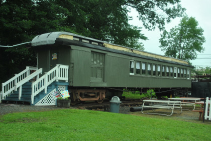 New York, Ontario & Western wooden bobber caboose 8146 built by the railroad in 1883. The museum acquired it in 2009 from Trolleyville when that museum became defunct.