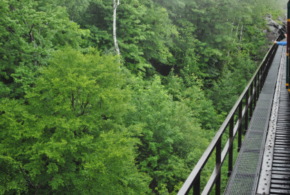 The train crossed the Frankenstein Trestle named for Godfrey Frankenstein, a German-born artist who spent time painting in the Crawford Notch in the 1800's. It was built in 1893 to replace the wrought iron trestle built in 1875 and was strengthened in 1930 and 1950 to handle the heavier train loads. It is 500 feet long and 80 feet high with a four degree curvature to the left.