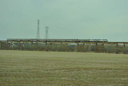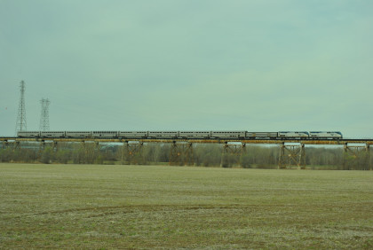 Amtrak's Southwest Chief train 4 crossed the Santa Fe Railroad Missouri River bridge just east of Sibley.