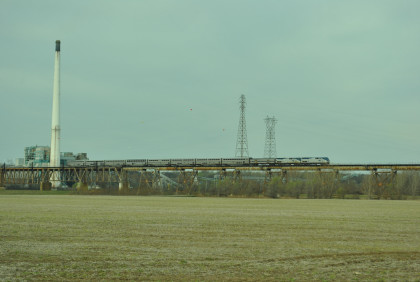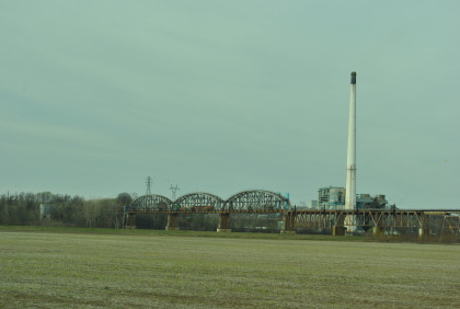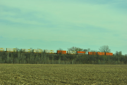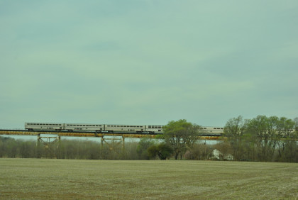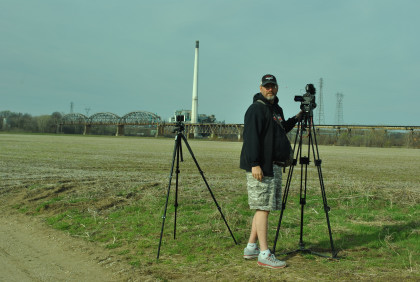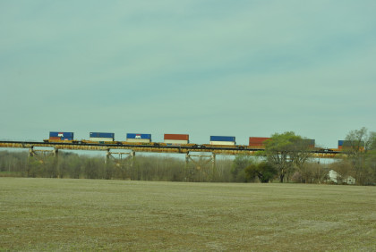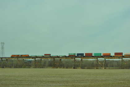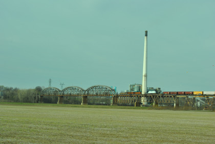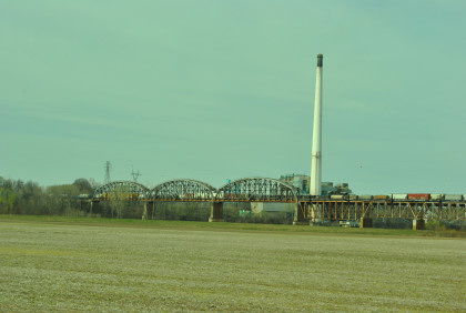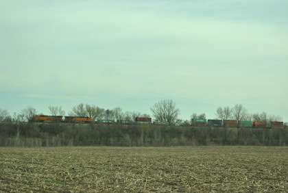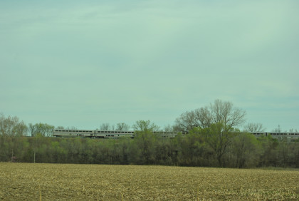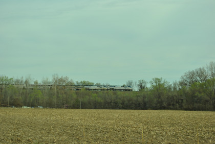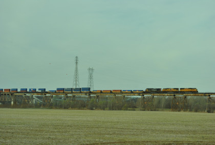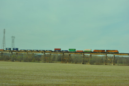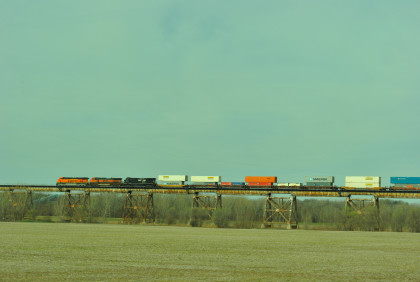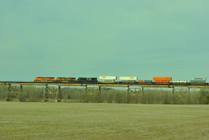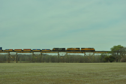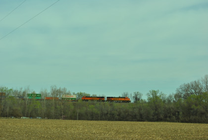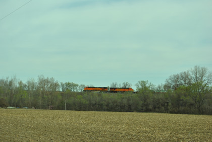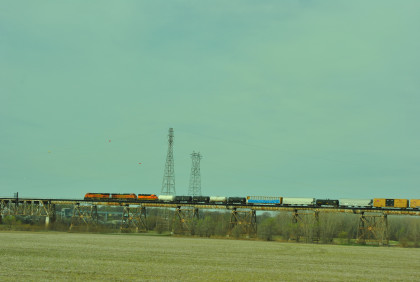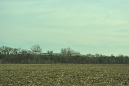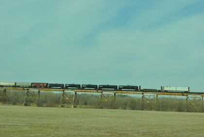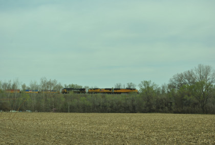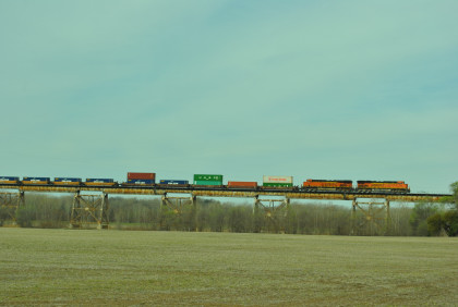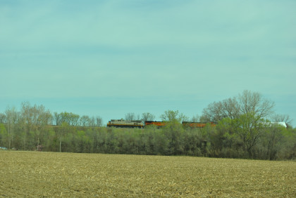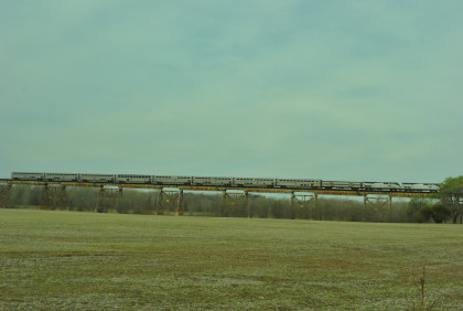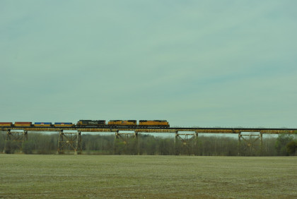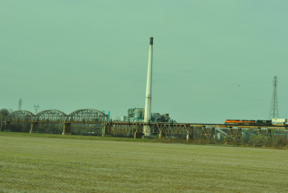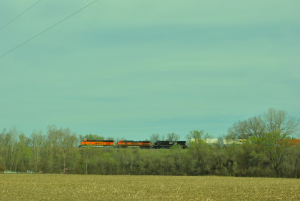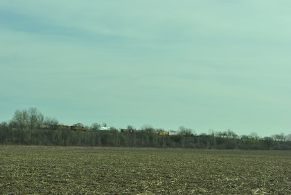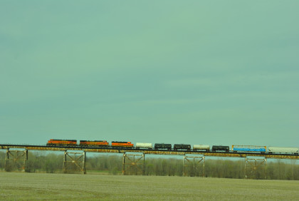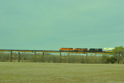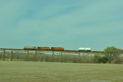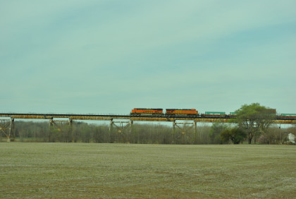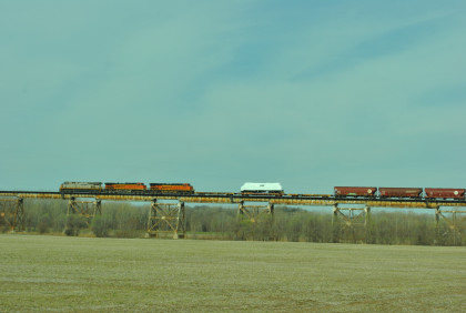 We are dedicating the La Plata Spring Railfan Event 2015 to the memory of Winston Walker. We wish you were here with us and you are truly missed. I met Jim Choinere in the lobby at 6:00 AM and we drove out to Orrick, passing a Wabash caboose and found our way out to the Santa Fe bridge on which I reached my One Millionth Rail Mile. This was my first time visiting this spot to photograph trains crossing the bridge. We did not have long to wait.