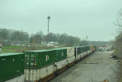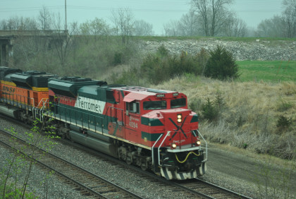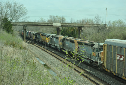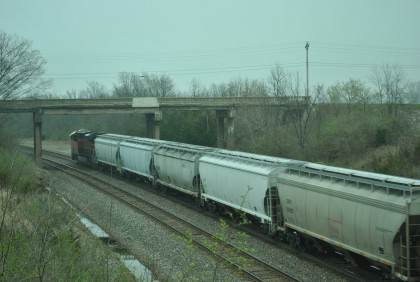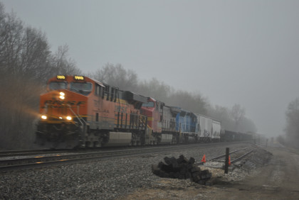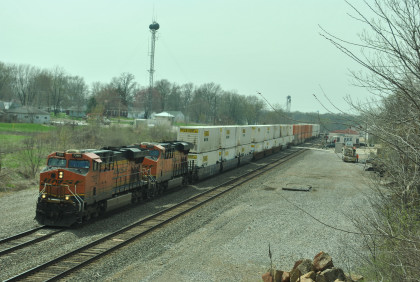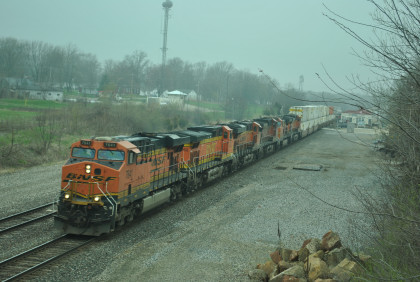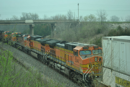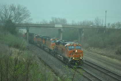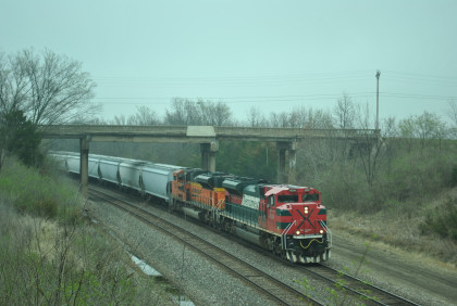 BNSF 4175 East with CN 5743 and HLCX 8137, as well as four dead units in this motive power consist went through town.