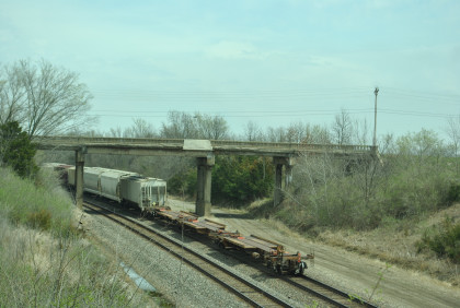 Amtrak's Southwest Chief Train 4 at the old bridge east of Gibbs. We returned to the Depot Inn & Suites so I could get my computer and John could get his own van. Jim and I then drove out to the Chris Guenzler Million Mile Lookout Point and set up for what we needed to do there this day.