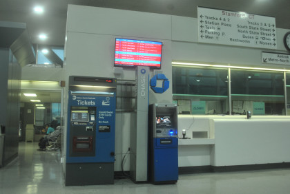 Interior of the station. We went to the basement and found a Subway to get dinner and we took it back into the station to eat it, after which we returned to the wet platform and found a dry spot to watch trains.
