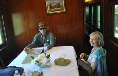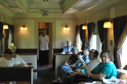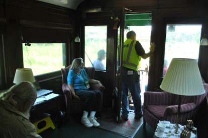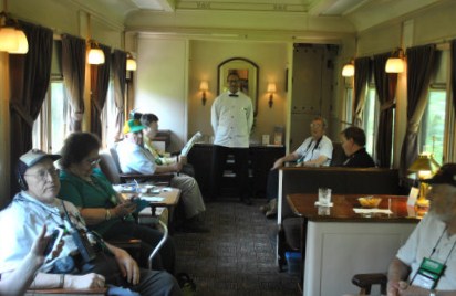 Interior of "Dover Harbor" with good friend Kenny Brooks in white. "Dover Harbor" is a heavyweight baggage-library car built by Pullman Company in 1923 as "Maple Shade". It was assigned to the Pennsylvania Railroad and rebuilt in 1934 and re-named "Dover Harbor" - one of eight cars to be designated in Dover Series. It was then assigned to Michigan Central Railroad and saw service on Cleveland Limited and Knickerbocker trains in the 1940s. In 1953, it was painted from Pullman livery to New York Central livery and assigned to Montrealer and Washingtonian. The car was retired in October 1965 and sold in 1967; the Washington DC Chapter of the NRHS purchased it in 1979. It is the only operational heavyweight Pullman revenue car for private use on Amtrak trains.
