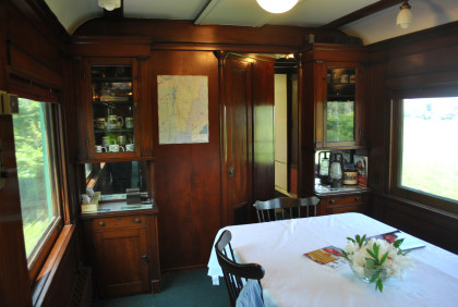 Interior of the Vermont Railway business car "Macintyre" with open platform and observation room, was built by Bethlehem Steel Company in 1923 as Erie 4. It was later sold to the Grand Trunk Western. The car moved to Bellows Falls when Glenn Davis, one-time head of the Vermont State Police, bought the car and moved it to Montpelier Junction where he lived in it. Mr. Davis became President of the Green Mountain Railway and moved it to Bellows Falls. He then sold the car to Rock MacIntyre and after he ran into financial difficulties, it became property of the Vermont Railway..