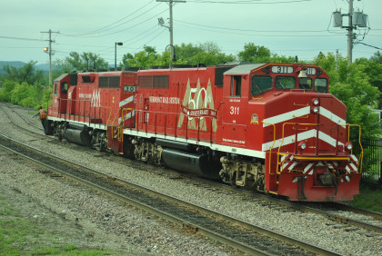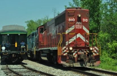 The power for our train, Vermont Railroad GP40-2LW 311 (ex. HLCX 9662, nee Canadian National 9662, built by Electro-Motive Division in 1976) in the 50th Anniversary paint scheme and Vermont Railroad GP40 301 (ex. CSXT 6790, exx. Seaboard 6790, nee Western Railroad of Alabama 703) built by Electro-Motive Division in 1967).