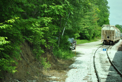 After proceeding only a few feet the train suddenly encountered a washout. Three of the cars started to sway violently. The crew could only helplessly watch as three cars slowly settled lower and lower in the water, as there was no grade left under the ties.