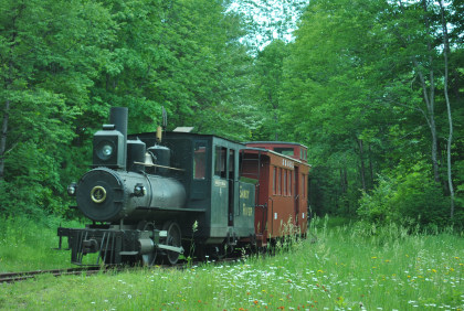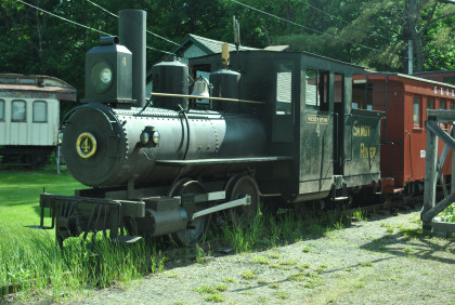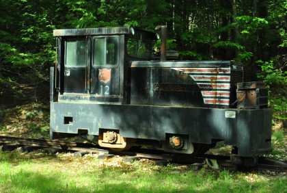 Sandy River and Rangeley Lakes 12 ton switcher 12, nee U.S. Metals 12, built by Brookville in 1981, at the south end of the railroad.