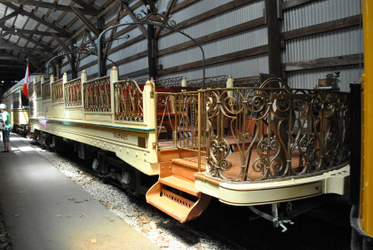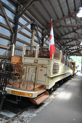The observation cars were so successful that two more such cars were eventually constructed 1924. In 1954, a three-window front windshield was installed on each observation car. All four operated sightseeing tours around Montreal until 1957 and were available for charter for another year. The sightseeing cars were considered too iconic to scrap. All four are now preserved. This particular car differs from conventional open cars in that it has no roof and its seats are arranged theater-fashion at progressively higher levels on either side of a center aisle. It is a uni-directional car with controls only at one end. The car features fine iron grillwork on the sides and ends and two brass arches topped with light bulbs and carved wood beavers. There were about a dozen similar cars in a few cities in Canada and the United States. The acquisition of 2 was sponsored by the Carling Brewing Company and included a tour of several New England cities and towns. In the 1980's, the museum restored 2 under a grant from the U.S. Institute of Museum Services.