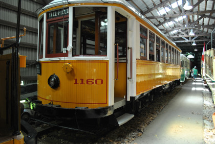 Prior to coming to Seashore Trolley Museum, 1160 was stored in the upper level of James Street Car Barn in New Haven. While being stored there the track outside the barn was removed making an interesting challenge in loading the car for shipment to Maine. A ramp was constructed from wood timbers and rail from the entrance to the Barn out to the truck and trailer. 1160 was then unceremoniously dragged onto the truck and the reverse occurred when it reached Seashore as there was no operational power at that time. The car did operate at Seashore during the beginning years of operation but was put into storage after its compressor failed. Other than shifting moves, it did not move much until 1988 when restoration of the car began. Restoration continued through the 1990's and 2000's, completing in 2011. Restoration involved dealing with worn out trucks, elongated bolt holes through which passed figure-eight shaped bolts, worn out bushings and bearings, and rotted wood. Much of the original components and wood still remain.