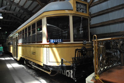 Cleveland Railway centre-entrance suburban car 1227 built by the G.C. Kuhlman Car Company in 1914. These cars were designed by Cleveland Transit Commissioner, Peter Witt, and featured center doors. Passengers entered at the right center door and exited from the left center, paying when they passed the conductor who sat between the two doors. The design also included at high-domed roof with Scullin ventilator louvers. Cleveland designed these cars to haul a trailer car.