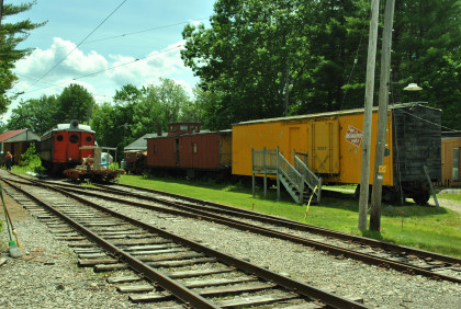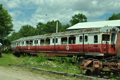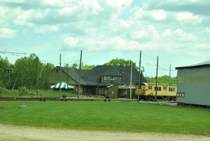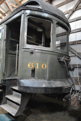 Single-end cars were the rule, coupled back-to-back in trains using a minimum of two cars. The M&SC usually headed a train with a freight motor car to carry milk, farm produce and other freight. 610 is a classic interurban with wooden sash and a coal stove to provide heat. The M&SC shut down in 1956 after its tracks on the St. Lawrence River bridge at Montreal were converted to highway traffic. When the M&SC ended service, the CNR donated 610, along with M&SC freight motor 504, to Seashore. The year before, Seashore had also acquired M&SC steel interurban 621. The museum intended to operate 610 and 504 as a multiple-unit mixed train. For many years they were the site of Seashore'ss New Year’s Eve celebration, with the two loud horns sounded at midnight in the cold Maine woods. In recent years the train has experienced various problems, keeping it out of service.