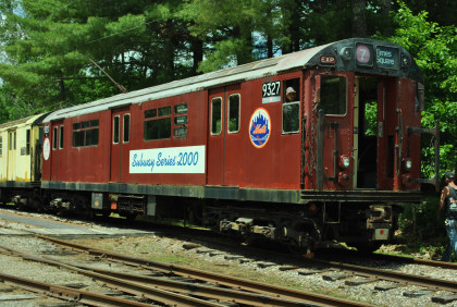 In the 1980's, this car received the red, Teflon-coated paint scheme. Over 1,400 New York subway cars, known as "Redbirds", received this paint as part of a successful effort to combat graffiti. In 2000, the baseball World Series was a match between the New York Yankees and the New York Mets. Because the home stadiums of both teams were served by New York subway lines, this was popularly called a "subway series" - the first since 1956. Car 9327, then serving the Mets' Shea Stadium on the Flushing line, was one of 11 cars to sport the "Subway Series" paint scheme. After retirement, 9327 came to the museum while almost 1,300 of the "Redbirds" were sunk in the Atlantic Ocean to create artificial reefs.