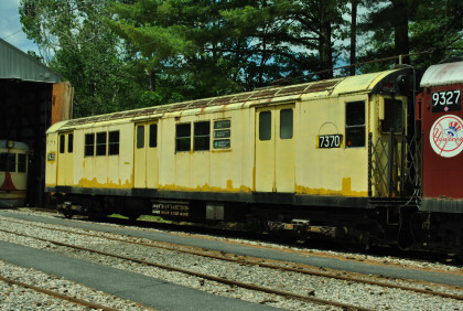 New York City Transit R-22 Main Line IRT subway car 7371 built by American Car and Foundry in 1957. The R-22 cars were dependable, fast and good riding. Car 7371 was originally painted dark green but spent most of its service life in a silver and blue scheme. After retirement from regular service in 1987, it received a yellow paint scheme and continued in subway maintenance service until 2003.