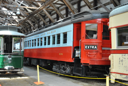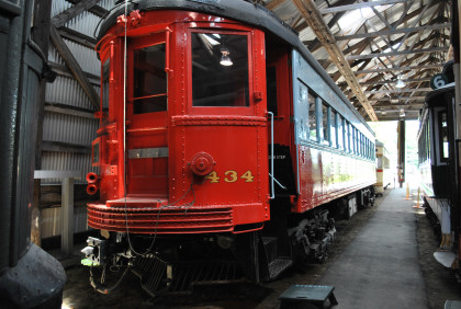 The CA&E rebuilt 434 in 1951 and the car's paint scheme changed from blue to red. In the 1950's, the CTA tore down its Garfield Park elevated line to make way for the Eisenhower Expressway and operated on temporary street-level tracks until construction of a new line down the expressway median. In 1953, the CA&E determined that operation on the temporary line was not feasible and stopped running its trains over the CTA. Many CA&E passengers, faced with the need to change trains at Forest Park, stopped using the interurban. When the CA&E abandoned all passenger service in 1957, 434 was stored at the line's shops in Wheaton. In 1962, Seashore arranged to acquire 434 and had it moved to temporary storage at the Chicago South Shore & South Bend Railroad shop in Michigan City, Indiana. In early 1963, 434 moved by rail to Kennebunkport and arrived in operating condition. Between 1996 and 2002, a member sponsored a major restoration project which put the car in excellent condition. The car is painted in the red livery it had after the 1951 rebuilding.