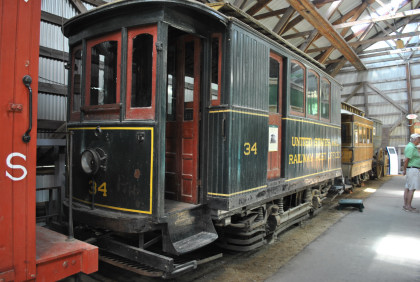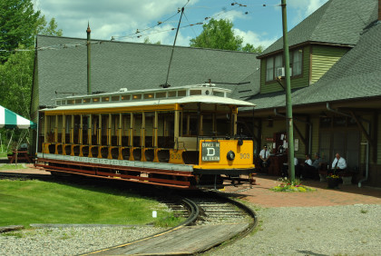 Bidderford & Saco Railway Company 12 bench open car 31 built by the J.G. Brill Company in 1900. This is the museum's oldest open car and the museum's first car. It is the oldest surviving Brill design electric open car and rides on Brill's patented 22E "maximum traction" trucks which featured two large wheels mounted on the axle driven by the motor and two small "pony" wheels on the other axle. The truck was designed to throw more weight on the motored axle so that maximum traction might be obtained without spinning the wheels.