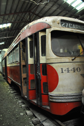 In 1968, 1440 was the first PCC to come to Seashore. The Pennsylvania Railway Museum Association (now, Pennsylvania Trolley Museum) at Washington, Pennsylvania assisted the museum in selecting the car, negotiating with PAT and loading the car for transport. Seashore quickly replaced the roof and repainted the interior and exterior. The exterior carries the Pittsburgh Railways crimson and cream paint scheme. Like other Pennsylvania streetcar systems, Pittsburgh used a five foot two-and-a-half inch track gauge so Seashore replaced the wheel and axle assemblies in 1440’s wide gauge Clark B-2 trucks with standard gauge wheel and axle sets acquired from Boston's MBTA but originally from Washington's DC Transit. Seashore also modified the tread brakes and track brakes to standard gauge. The MBTA initially turned down Seashore’s request for the wheel and axle sets as they still operated a large PCC fleet and retained the DC trucks as spares. However, when the MBTA had an urgent need for an overhead wire line car, Seashore responded by lending ex-Claremont, NH car No. 4 in return for the four Washington wheel and axle sets.
