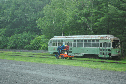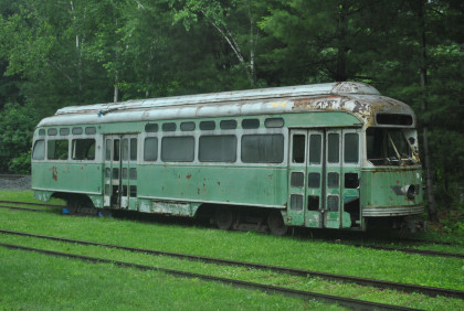 Massachusetts Bay Transit Authority PCC car 3321 by Pullman-Standard in Worcester in 1951. It, along with 3399, ran in Boston for their entire service life from 1951 to 1985. They served primarily on what is now the Green Line. They were then stored for a number of years before being used in an abortive streetcar project in Brooklyn, which left them stored on an exposed pier. They were flooded by Hurricane Sandy and brought to the Museum in 2015. MBTA 3321 is the last trolley car built in Massachusetts.