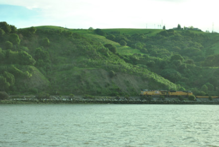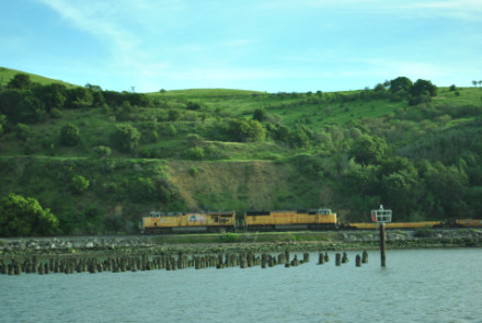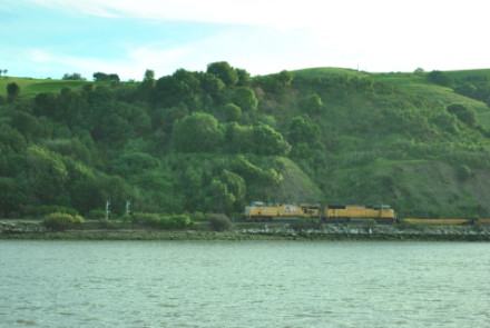 Union Pacific 7624 East along the shore east of Crockett. Now we waited for the final Reno Fun Train of the year.