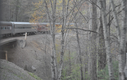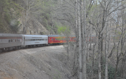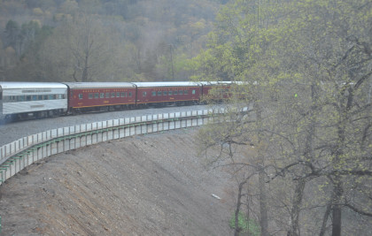 A picture of a map from one of our passengers. Thank you, Trains Magazine, for producing this map. Now the part of the excursion I have always wanted to do, the ride over the Old Fort Loops of the Southern Railway. Designed by Colonel A.B. Andrews and built between 1875 and 1879, the line snakes through the Appalachian mountains between Old Fort and Asheville with a maximum gradient is 2.2 percent - up 2.2 feet and out 100 feet. The rail line is 15 miles long while Interstate 40 is seven miles long. Land was moved to form cuts or fills so the line could maintain the 2.2 percent grade. Since the railroad has to maintain a maximum gradient, it undulates and curves over and around the Appalachian mountains.