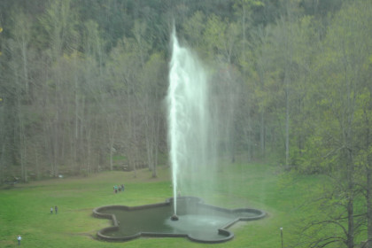 Andrews Geyser shoots water continuously to a height of about 80 feet. Its water supply is drawn from a pond located at the current site of the Inn on Mill Creek, a local Bed & Breakfast. The Inn's property contains the original dam constructed by the railroad in the late 19th century, and the pond formed by the dam with the water of the Long Branch of Mill Creek. A 6-inch-diameter cast iron pipe runs from the dam, through a hidden gate valve, then underground approximately two miles downhill to the fountain. The water comes out a half-inch nozzle pointed skyward, and the 500 feet of elevation difference creates the pressure that drives the fountain.