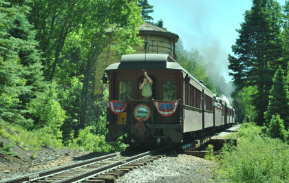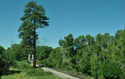 Passing the over one hundred-year-old Jukes Tree, a Ponderosa pine named for photographer Fred Jukes, who captured the line (and this spot) in the early 20th century. Robin and I took off after the train in chase mode.