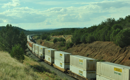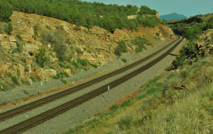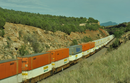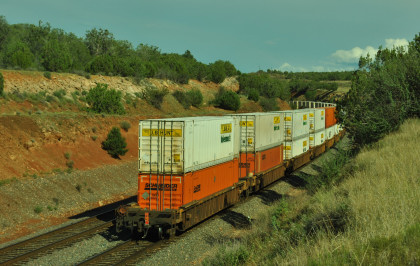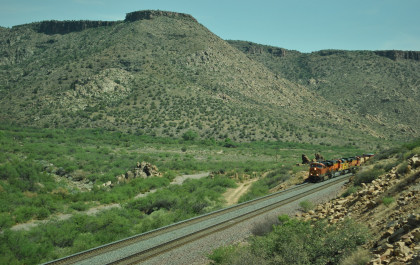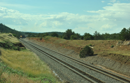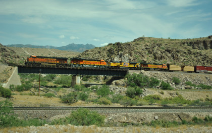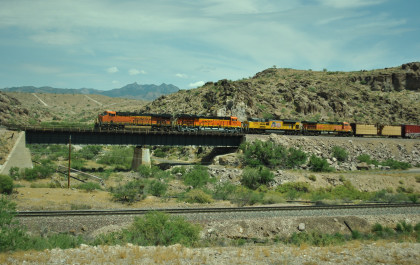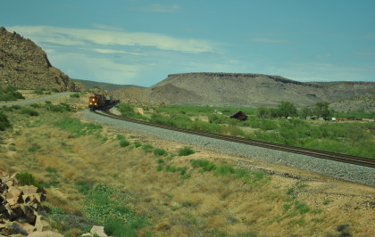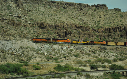 The Trip Starts! 7/1/2016I got up, packed the car and left my house at 8:10 AM and took surface streets to Robin Bowers' apartment to pick him up. We loaded his luggage and were off, taking the car pool lane on the San Diego Freeway to the Newport Freeway, to the Santa Ana Freeway then the Orange Freeway to the Pomona Freeway. We had to escape it to get onto Interstate 15 which we took to Interstate 40 east. We made a rest stop after Newberry Springs then our next stop was in Needles for petrol and lunch at Carl's Junior. We crossed into Arizona then spotted the first of three trains on the way to Kingman, taking US 66 through Kingman Canyon and caught up to the third train.