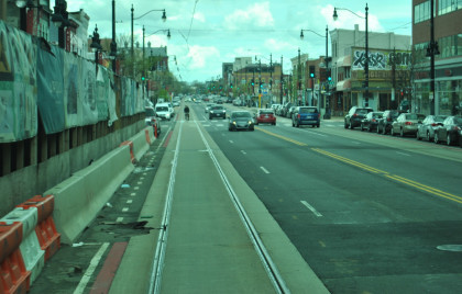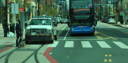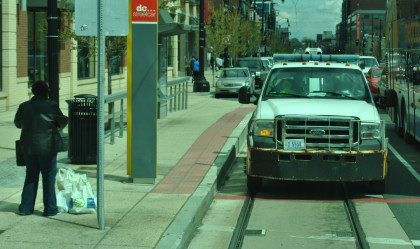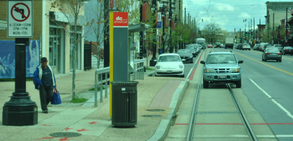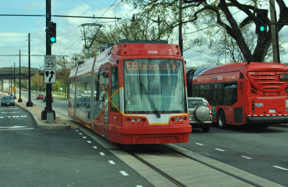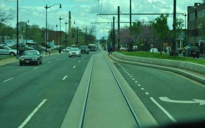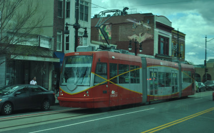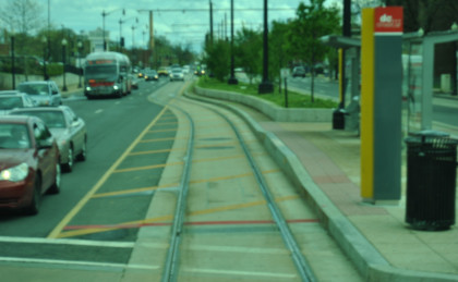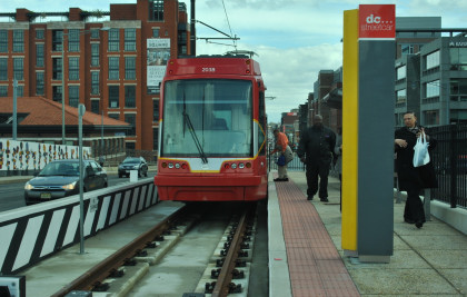 A Virginia Rail Express train was leaving for Broad Run. I went to Club Acela where I checked in, stored my luggage and headed out to find the brand new Washington Streetcar. I was pointed in the right direction and followed the signs, passing the rental car offices and bus bays then down a driveway to the street, crossing to the median where I found a waiting Washington Streetcar to ride.