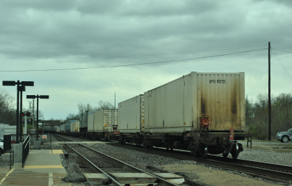 After a great time at the La Plata 2016 Spring Railfan Event, I woke up and checked things online before John Green and I went to the closed Granma's Cafe on the La Plata Square then tried the Choo Choo Cafe which did not open until 8:00 AM. We went back to Room V and I showed him Winterail programs from this year as well as 2013, 2012 and 2011 then went to Choo Choo Cafe at the La Plata Pharmacy for breakfast on a rainy morning. I returned to my room and watched two episodes of "NCIS" before checking out of the Depot Inn & Suites for this visit then drove the rental car back to the station. I had one BNSF westbound grain train then the crossing gates went down and stayed that way for the reminder of my stay. I moved my bags out onto the platform, then heard the horn of an eastbound train and decided to photograph.
