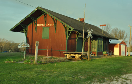 The Keokuk and Western (predecessor of Chicago, Burlington and Quincy) station in Downing, Missouri built in 1872. Originally chartered in Missouri as the Alexandria and Bloomfield Railroad Company, by Special Act of February 9, 1857, the act called for the building of a railroad from Alexandria, Missouri, in the direction of Bloomfield in the state of Iowa, to the northern boundary of the state of Missouri. A subsequent Act on February 19, 1866, changed the corporate name to the Alexandria and Nebraska City Railroad Company. On March 2, 1869, the Missouri legislature passed a general law authorizing any railroad company in Missouri to consolidate with a railroad company of an adjoining state. The railroad that consolidated with the Alexandria and Nebraska City Railroad was the Iowa Southern Railway, chartered in 1866 and supported by Centerville, Iowa booster Francis Marion Duke. With the combination of the Alexandria and Nebraska City Railroad Company and the Iowa Southern Railway, the Missouri, Iowa, and Nebraska Railway Company was created under general laws of Iowa and Missouri.