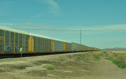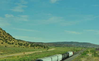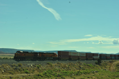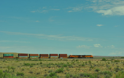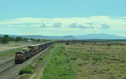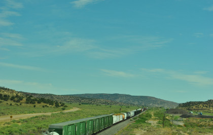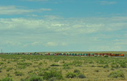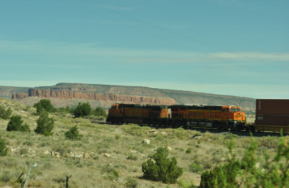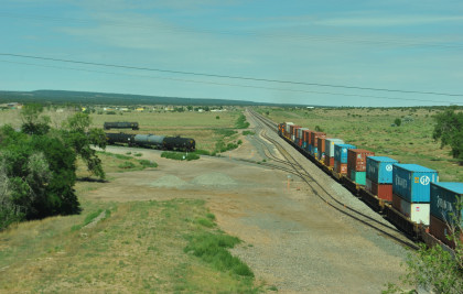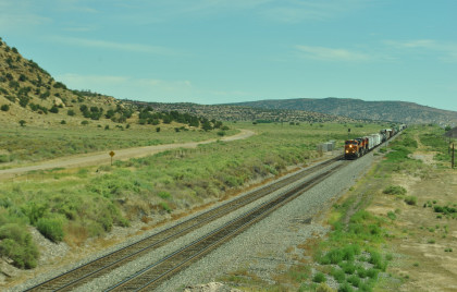 Robin and I slept in this morning because we would gain an hour once we reached the Arizona border. We had breakfast at the Travelodge then packed and loaded the car before checking out and filling the car with petrol for the day. Driving through Grants on old US 66, we looked for trains then drove to Baca Road, turned toward the tracks, parked and saw a green eastbound signal so we waited.