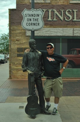 The author beside Standin' on the Corner Park, commemorating the song "Take It Easy" which was written by Jackson Browne and Glenn Frey and most famously recorded by Frey's band, the Eagles. The song includes the verse "Well, I'm a-standin' on a corner in Winslow, Arizona, and such a fine sight to see. It's a girl, my Lord, in a flatbed Ford slowin' down to take a look at me." The park contains a two-story trompe-l'œil mural by John Pugh, a Ford flatbed truck, and a bronze statue by Ron Adamson entitled "Easy" (which resembles Browne, but represents "the troubadour") who is standing on a corner with a guitar by his side. The park is surrounded by a wall of bricks, with windows to peer into; each brick has a donor's name on it, and a story by each of the donors describing their fondness for Winslow, Arizona.