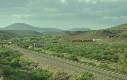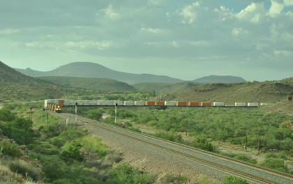 BNSF 6583 West nearing Kingman. We pulled off the highway and called Elizabeth to ask her to make a reservation for us at the Best Western in Needles since I did not want to stay in Kingman in a dust storm. Once on the move again, we caught up and passed that train then crossed the Colorado River and were back in our home state of California. We checked into the Best Western and it was 119 degrees Farenheit when we did.