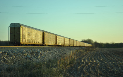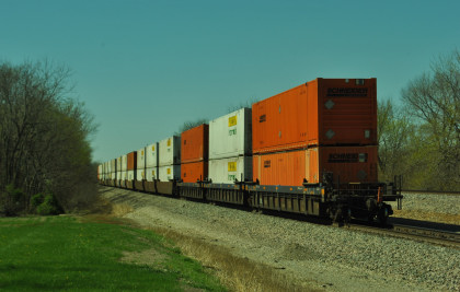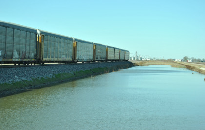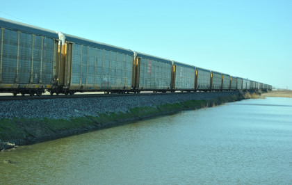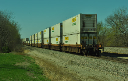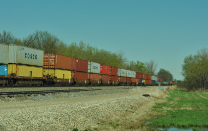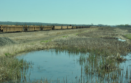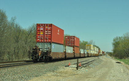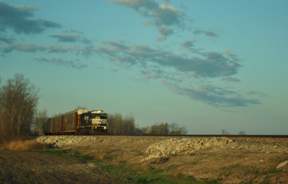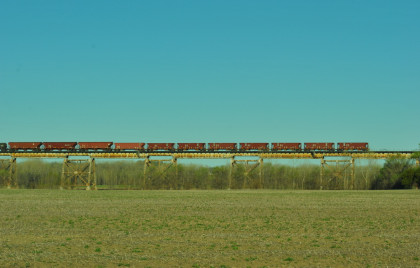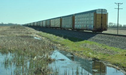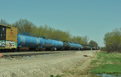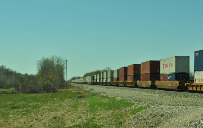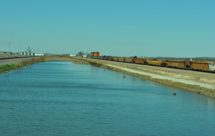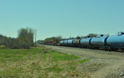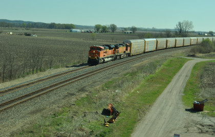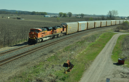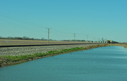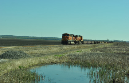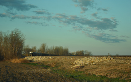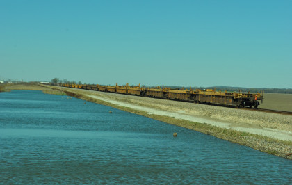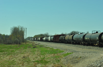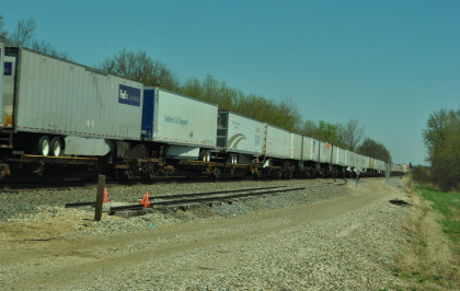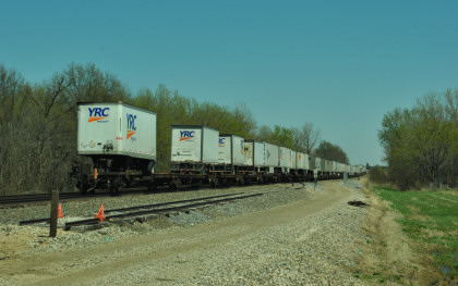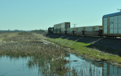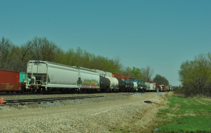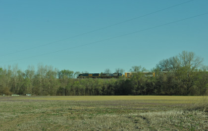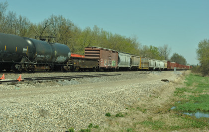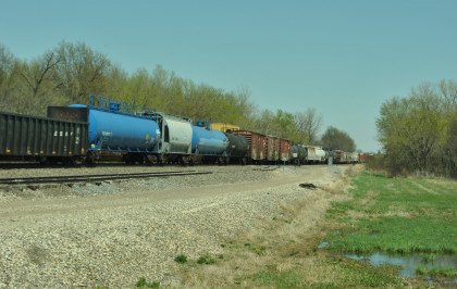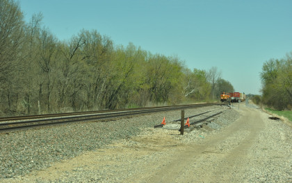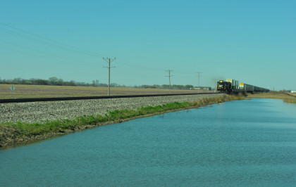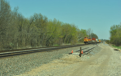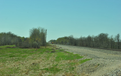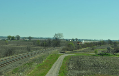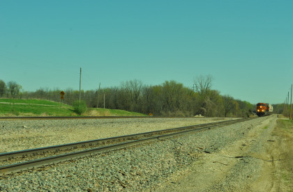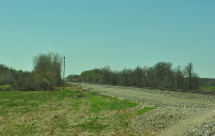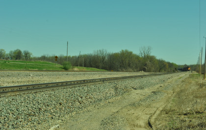 The track inspector truck came across the bridge and found a defect and two other trucks stopped on the west approach to the bridge. This was not a good sign, so we left and headed to Richmond to McDonald's where I had Hot Cakes and sausage. From here we headed east and just east of Hardin, we saw our next train coming towards us.