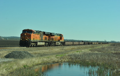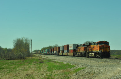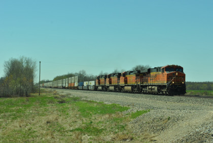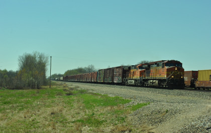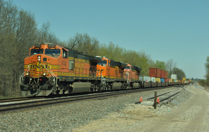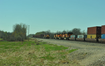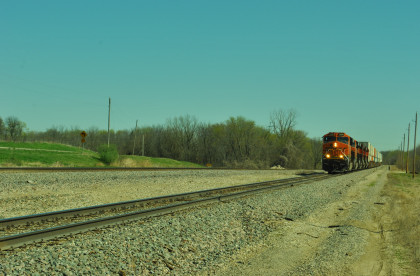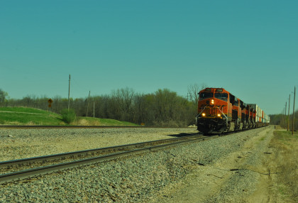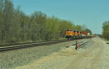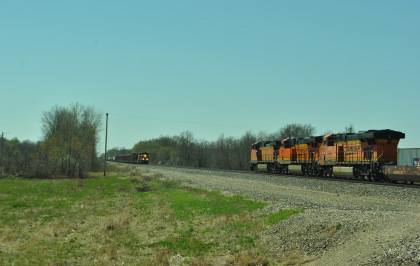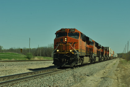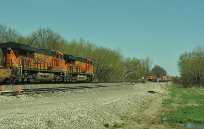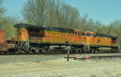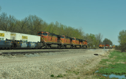 BNSF 7300 East at the Route E/Main Street crossing MP 354.49. BNSF 4142 West finally started moving just as BNSF 5323 East came into view out of the west.