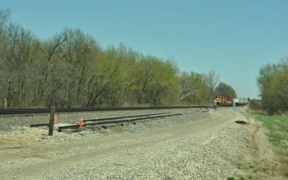 BNSF 4142 West met BNSF 5323 East at the Route E/Main Street crossing MP 354.49. From here we headed back to La Plata via South Gifford for a picture of the old station there.