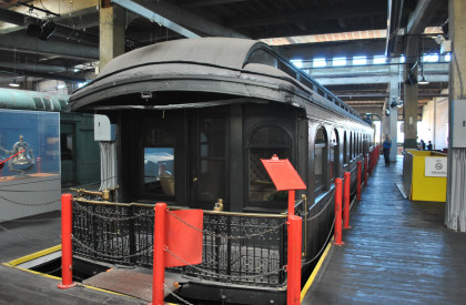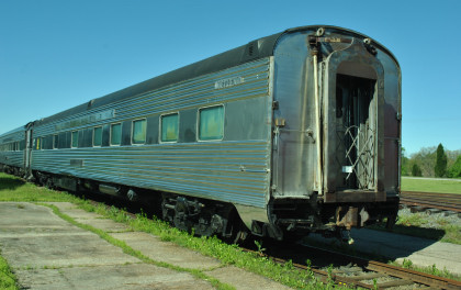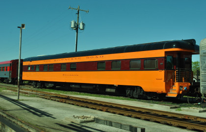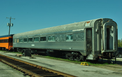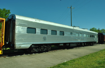 North Carolina Transportation Museum table car 604 built by Pullman Standard in 1948 for the Baltimore and Ohio Railroad for its first-class Capital Limited train and would later be sold to New York Central. It was rebuilt by the Virginia Central in 1991 but retains its art deco interior decor and original metal artwork on the walls.
