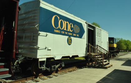 Cone Fabrics box car 16 built by Pullman-Standard in 1937 for the Central of Georgia Railroad. Cone Mills bought 16 of these in 1972 to move flannel a quarter of a mile from its Revolution Mill to its Proximity Print Words. Saved from scrapping by the Greensboro Chapter of the National Railway Historical Society in 1983, this car was donated to the museum in 1999.