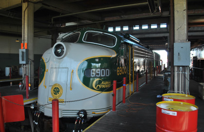 Southern Railway E8A 6900, nee Cincinnati, New Orleans and Texas Pacific 2923 built by Electro-Motive Division in 1951. Until Amtrak took over passenger services in 1971, the seven E8s hauled Southern's crack passenger trains including the Royal Palm, the Southern Crescent, Southerner and Tennesseean. They were initially painted green with aluminium striping but changed to black in the late 1950s. In 1972, Southern President W. Graham Claytor had all the E8s returned to green and aluminium to reflect pride in the railroad's history. At the same time, 2923 was re-numbered 6900. It ended its career hauling the Southern Crescent in 1979 and was donated to the museum in 1980.
