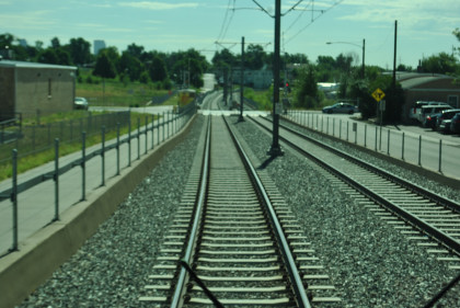 Elizabeth and I got up at the Super 8 Motel and tried their breakfast then walked over to the Holiday Inn and joined the line for the bus. This was not a bus to the A Line Commuter rail station as the convention booklet had stated. Instead it was a bus to Denver Union Station so we would see some of the neighborhoods on the way into town. We made it to Union Station and the bus took us to the underground bus plaza. It was a short walk to where a wrapped light rail train was waiting. Who would give a wrapped train to a national group for their tour of their system? You could not take pictures through the side windows. I knew a view through the operator's cab would be the only way I could document this trip. In addition, a gas leak in downtown had that section closed so we could not ride the entire Denver Light Rail system. We were supposed to leave Union Station at 9:00 AM but did not leave until 9:17 AM.