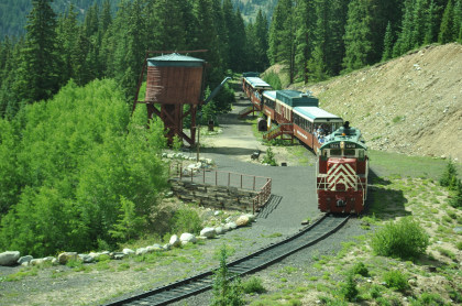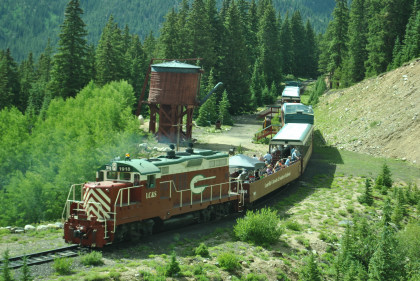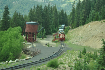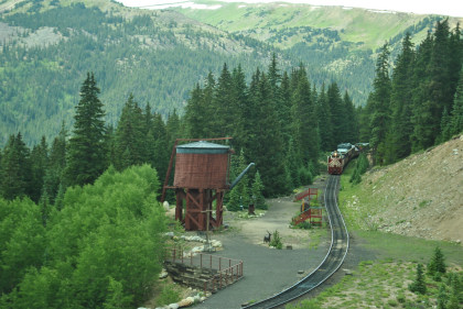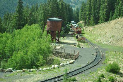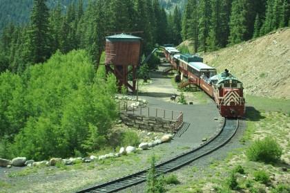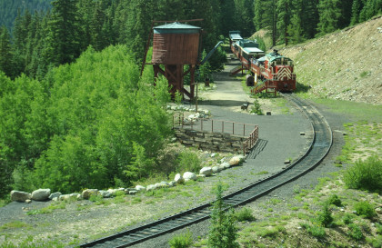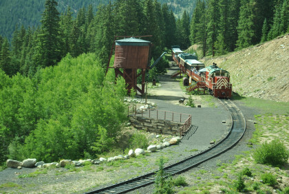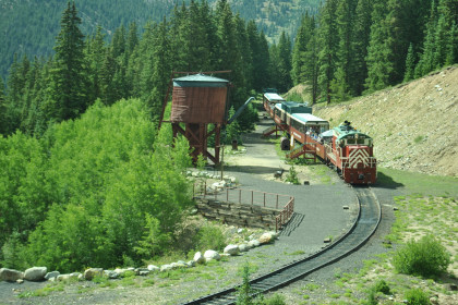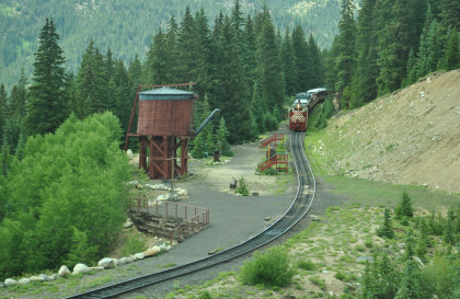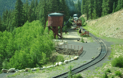 Highway 91 over Fremont Pass. On the way back, Steve Barry and I met with the train crew about the photo runby at the French Gulch water tower and it was decided there would be two runbys so we discussed the procedures for making it a safe experience for the passengers. Steve would take the lower photo line at the first runby and I would take the upper level for both runbys. No passenger could move until the train reversed. After the first runby and the train had reversed, people could then switch either to the upper or lower or stay on the same level. Steve announced it over the train's PA system and when we arrived, I was second off and headed to my appointed spot.