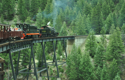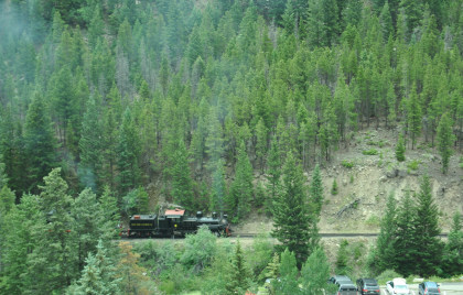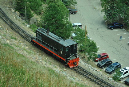 The steam engine sanded the flues and gave out a lot of smoke. We returned to Silver Plume and we were the first two bus hosts off the train. It had been a fantastic trip behind steam on the Georgetown Loop Railroad. Once everyone was back on the chase bus, we departed Silver Plume for the Scenic Overlook off Interstate 70. I led the way to the "Sweet Spot" for loop photography on the bike trail while Skip Waters brought up the rear. Elizabeth stayed at the overlook with the people who did not want to walk to the "Sweet Spot". I arrived down there in time to catch the diesel crossing Devil's Gate Viaduct.