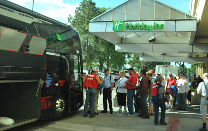 Elizabeth and I arose at the Super 8 and went to McDonald's for breakfast. I took Chris Parker to the RTD station so he could take the train to the airport for his flight home since unfortunately, he could not stay for the convention. The two of us and Robin walked over to the Holiday Inn for our safety briefing where we received our red safety vests and radios. We then went outside and talked to some of our passengers who would be on our trip today. The first bus arrived and we waited for our bus No. 3 to arrive.