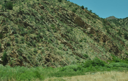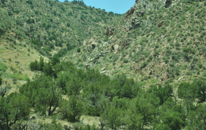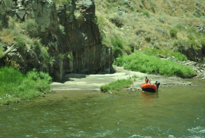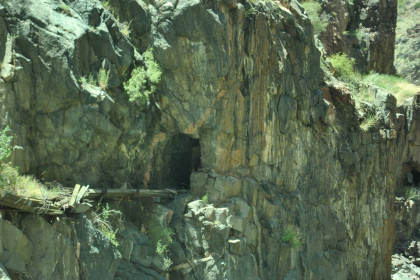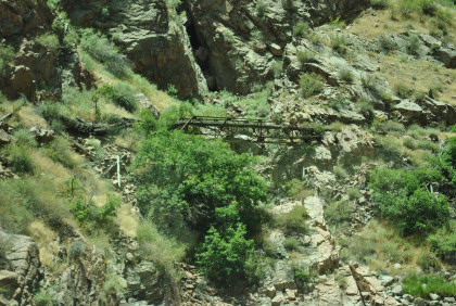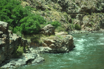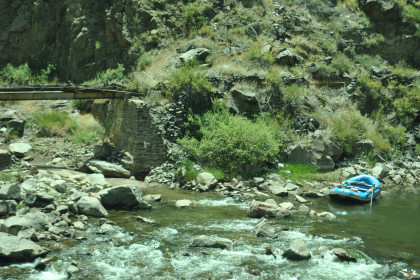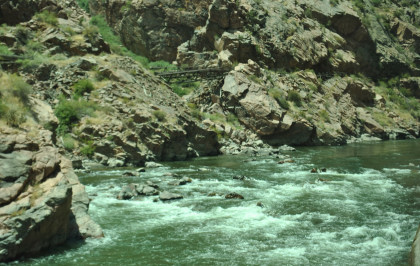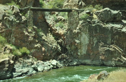 Nearing the Hanging Bridge built in 1879 and located along the north side where the gorge narrows to 30 feet and the sheer rocks walls plunge into the river. Designed by Kansas engineer C. Shallor Smith and built by Santa Fe construction engineer A.A. Robinson for $11,759, the bridge consists of a 175-foot plate girder suspended on one side under A-frame girders that span the river and are anchored to the rock walls. Strengthened over the years, the bridge remains in service today.
