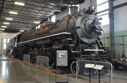 Spokane Portland & Seattle 4-8-4 700 built by Baldwin in 1938. It was acquired to haul the Inland Empire Express (daytime) and North Bank Limited (overnight) along the north shore of the Columbia River between Spokane and Vancouver, WA. By 1947, the SP&S started purchasing diesels for their premier passenger services. Through the late 1940s and early 1950s, the E-1s continued to pull secondary passenger trains but by 1954, diesels had completely replaced steam for passenger service and the E-1s were relegated to pulling freight trains until 1955. Finally, on 20th May 1956, a spruced-up 700, with its normally grey smokebox painted silver, hauled its last passenger train, the Farewell To Steam with a twenty-one car consist carrying 1,400 passengers from Portland, Oregon to Wishram, Washington and back. After the Farewell to Steam trip, 700, along with other SP&S steam locomotives, were sent to the scrap line. At the same time, however, the Union Pacific was offering to donate a steam locomotive to the City of Portland and the SP&S also offered 700. It went on static display at Oaks Amusement Park until 1987, then moved to the Brooklyn Rounshouse to continue work to restore it to operating condition. It returned to operation in 1990 and was added to the National Register of Historic Places on 26th January 2006.